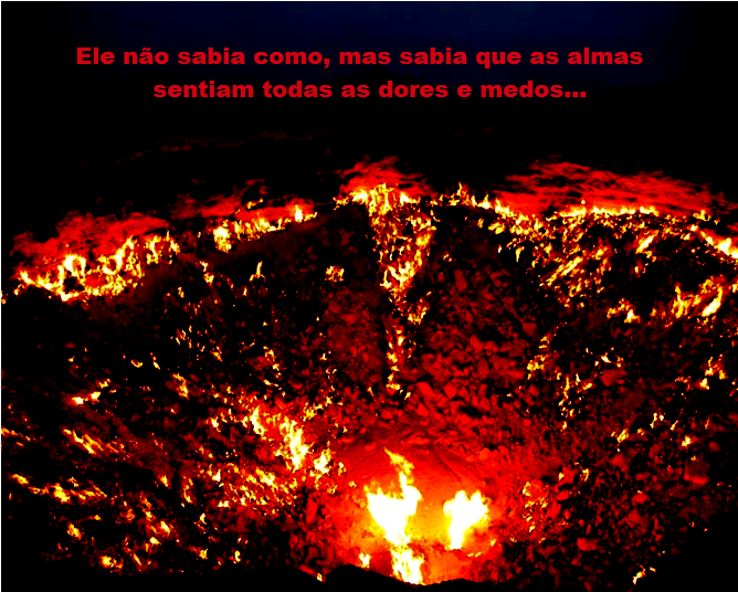 [quote_left]Ele não sabia como, mas sabia que as almas sentiam todas as dores e medos…[/quote_left]E sua dor era eterna! Pareciam que sofriam desde sempre e sofreriam para todo o sempre, pois por mais destruídas, por mais despedaçadas as almas não terminavam, para um deleite quase sexual de seres cruéis e felizes!